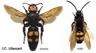 La scolie est-elle dangereuse ? Pas vraiment. C’est seulement la femelle « à tête jaune » qui peut piquer, le mâle étant dépourvu de dard. Si vous êtes confronté à leur présence profitez- en pour observer leur comportement. Les adultes se nourrissent de pollen et de nectar de fleurs et ainsi participent à la pollinisation naturelle. Évitons de les piéger sauf en cas de risque majeur de santé publique.