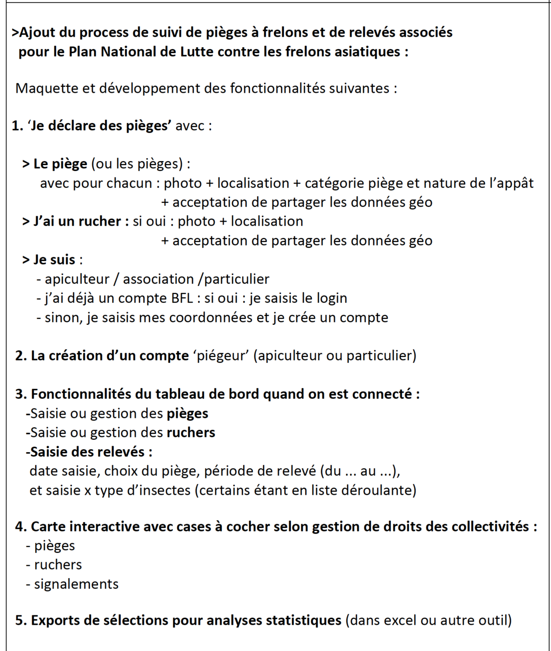 Le cahier des charges que BeesForLife prépare pour début mars 2023 pour le suivi du piégeage du frelon asiatique :